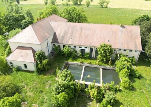 Das rund 20.000 m² große Grundstück beherbergt einen in massiver Stahlbetonweise errichteten Gebäudekomplex mit hohen Decken, großzügigen Flächen und einer durchdachten Infrastruktur. Besonders attraktiv: Die Gegebenheiten ermöglichen eine weitgehend autarke Nutzung – etwa durch die große, unverschattete Dachfläche (2000 neu eingedeckt) und drei aktive Brunnenhäuser.