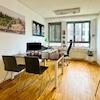 Edler Parkettboden sorgt für ein repräsentatives Ambiente, während die großzügige Einbauküche ausreichend Platz für Pausen und gemeinsames Essen bietet.