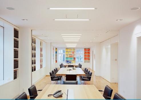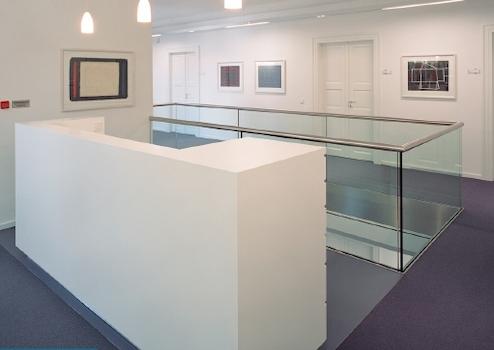 Die Bürofläche besticht durch ihre gehobene Ausstattung, zu der z. B. elegante Glastrennwände sowie eine hochwertige Cat7-Datenverkabelung gehören.