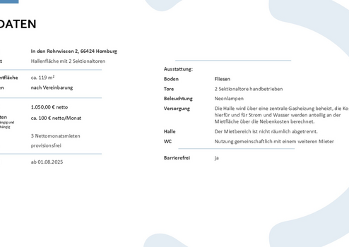Das im Jahr 2004 errichtete Gebäude befindet sich in einem gepflegten Zustand und liegt in einem etablierten Gewerbegebiet mit guter Anbindung. Die zur Vermietung stehende Hallenfläche ist mit zwei handbetriebenen Sektionaltoren ausgestattet. Der Mietbereich ist rund um die Uhr (24/7) über eine integrierte Schlupftür im linken Tor zugänglich. Zwei große Fenster im rechten Teil der Halle sorgen für eine helle, freundliche Arbeitsatmosphäre.