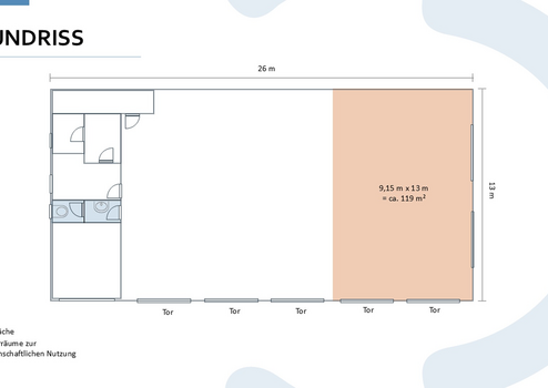 Die Mietfläche ist nicht separat abgetrennt und geht offen in einen benachbarten Mietbereich über. Die sanitären Einrichtungen werden gemeinschaftlich mit dem zweiten Mieter genutzt.