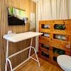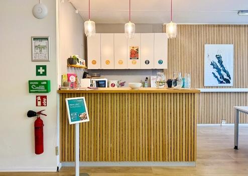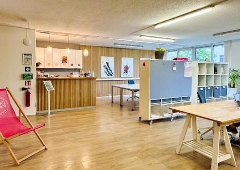 Die voll ausgestattete Gemeinschaftsküche mit großzügigem Aufenthaltsbereich lädt zum Netzwerken, Entspannen oder zu einer kurzen Kaffeepause ein – Kaffee, Tee und Hygieneartikel sind inklusive.