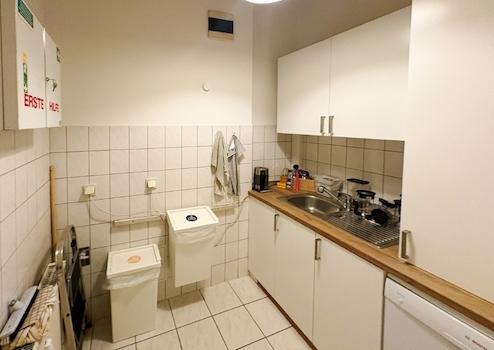 Die voll ausgestattete Teeküche bietet Raum für Pausen und Austausch; Kaffee, Tee und Hygieneartikel sind im Service enthalten.