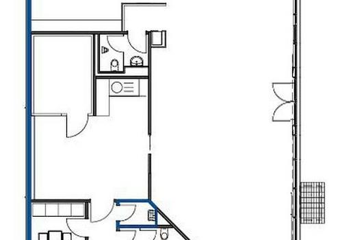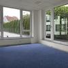 Die ebenfalls klimatisierte Büro- oder Praxisfläche entstand durch die Teilung einer größeren Gesamtfläche. Sie wirkt durch die großen Fenster sehr hell und freundlich. Glastüren sorgen für Tageslicht im Flur. In den abgehängten Decken sind die LED-Leuchten integriert. Das Büro ist mit Teppichböden ausgelegt. Der Aufenthaltsraum ist mit Küchenanschluss. Die WCs sind hell gefliest. Die EDV-Verkabelung verläuft in Bodentanks.