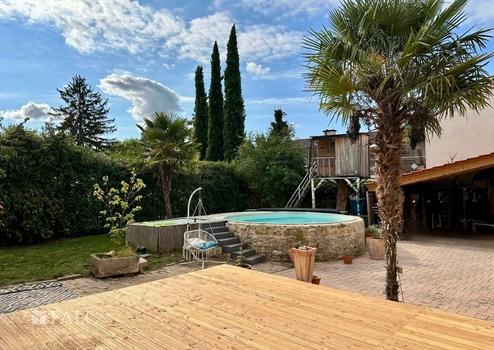 Vom Wintergarten gelangen Sie über eine große Terrasse in den herrlichen Innenhof und Garten des Hauses. Der Swimmingpool lädt zum Baden und Relaxen ein.