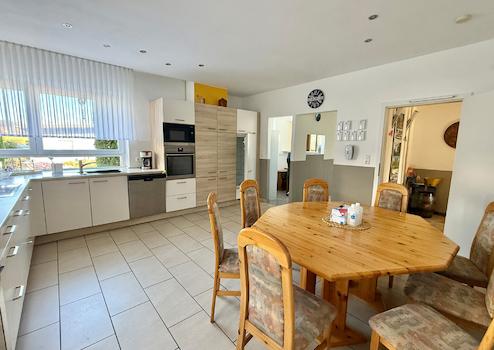 Die Wohnfläche beträgt ca. 285 m², ergänzt durch 142 m² Nutzfläche. Helle, freundliche Zimmer, ein großer Aufenthaltsraum mit Wohnküche sowie ein Balkon mit Fernblick sorgen für ein wohnliches Umfeld. Das parkähnliche Grundstück umfasst ca. 3.459 m² mit Terrasse, Garten, 1.552 m² Waldfläche und zahlreichen befestigten Stellplätzen. Das Inventar kann bei Bedarf übernommen werden.