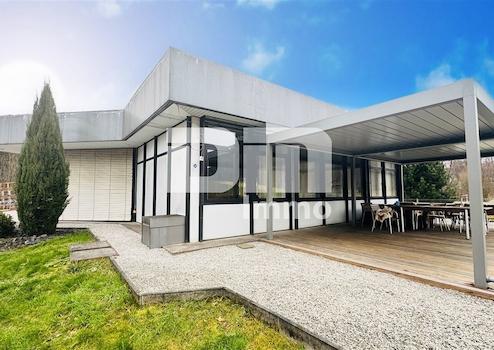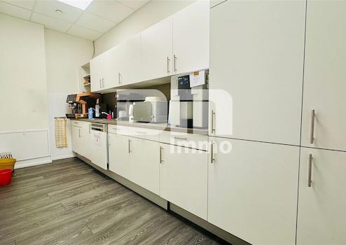 Ein zusätzlicher Pavillon BJ 1984 beherbergt weitere Sozialräume in Form eines vollausgestatteten Fitnessraumes, Teeküche, Ausstellung mit abgetrenntem Empfang, zwei WC-Räumen und Terrasse BJ 2023 mit Lamellendach und Bankiraiboden.