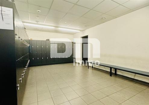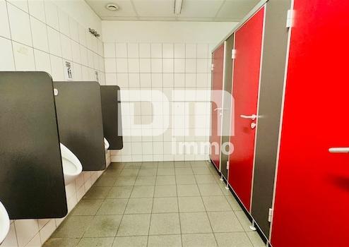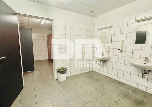 Das EG verfügt über einen Sozialtrakt mit zwei Umkleiden nebst Duschen und Waschräumen, HWR, Herren WCs (4x +4x Urinale), Frauen WCs (4x) sowie Technikraum und zwei abgeteilten Werkstattbereichen mit tragfähigem Dach.