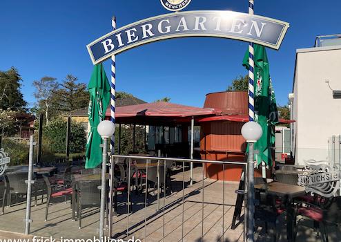 Biergarten (Faß) mit Außenplätzen und Besucher-WCs im Gebäude.