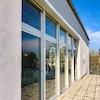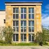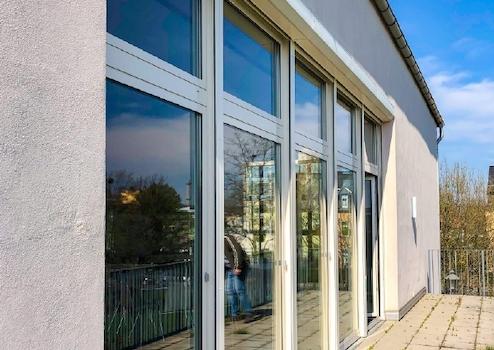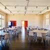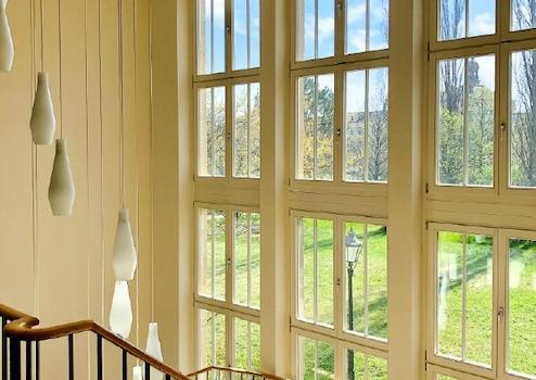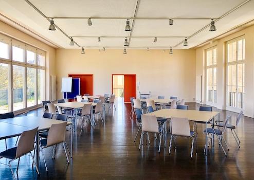 Die angrenzende Außenanlage lädt in den Pausen oder bei Veranstaltungen zum Verweilen ein und sorgt für eine angenehme Atmosphäre.