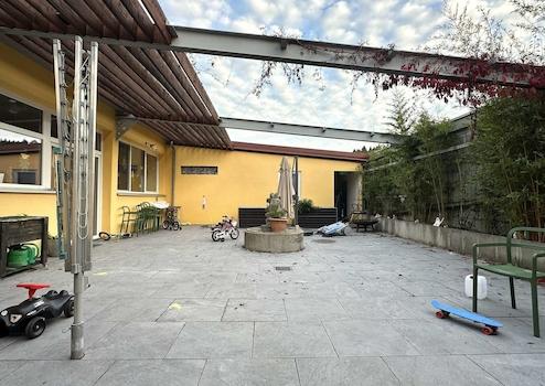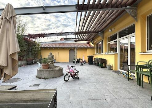 Der Innenhof mit Terrasse bietet eine angenehme Rückzugsmöglichkeit für Pausen oder kleine Außenaktivitäten. Zusätzlich steht im Außenbereich eine Werkstatt- und Lagerfläche für den Hausmeisterdienst bereit, sodass sämtliche betriebsrelevanten Aufgaben direkt vor Ort erledigt werden können.
