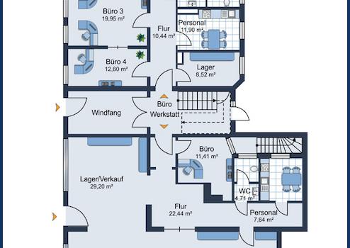 • Monatliche Miete Büro (Handwerkervermietung): 1.500 € (13,09 €/m² kalt)