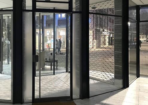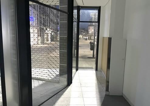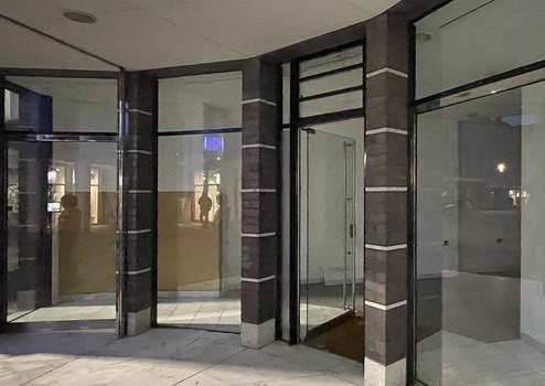 Entlang der geschwungenen und großzügigen Fensterfront können Sie perfekt Ihre Waren präsentieren. Der Eingangsbereich ist innen und außen mit hellem Marmor ausgelegt. Die Fensterrahmen sind aus hochwertigem Aluminium und poliertem Edelstahl gefertigt und die Eingangstür besteht aus Ganzglas.