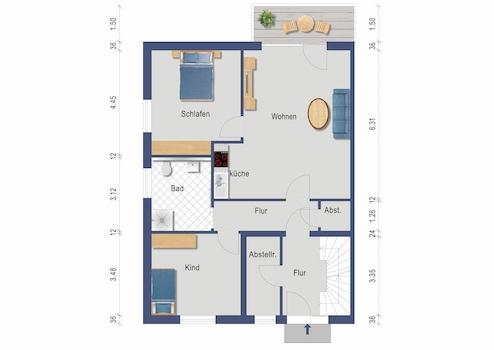 • Zimmer: 3 (2 Schlafzimmer, großzügiges Wohnzimmer mit offener Küche)