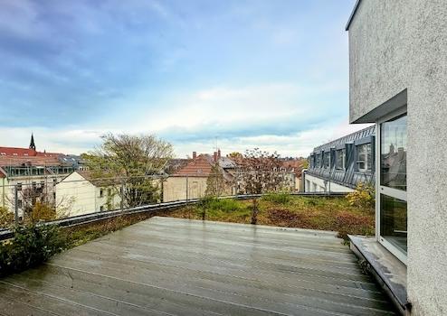 Eine angrenzende Terrasse lädt zu Pausen im Freien ein und ergänzt das angenehme Arbeitsumfeld.