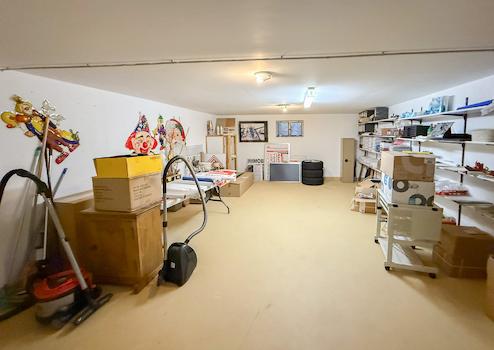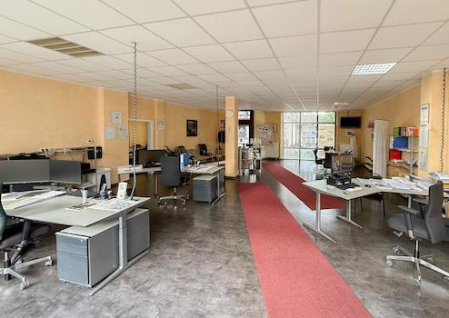 Im Erdgeschoss befindet sich eine großzügige Verkaufs- und Bürofläche von rund 130 m² mit einer breiten Schaufensterfront, die eine hervorragende Sichtbarkeit und helle, freundliche Räume schafft. Das Untergeschoss bietet neben der Küche und dem WC zusätzliche Lager- oder Archivflächen und rundet das flexible Raumkonzept ab. Die Immobilie präsentiert sich in gutem, gepflegtem Zustand und ist derzeit an ein Immobilienunternehmen vermietet.