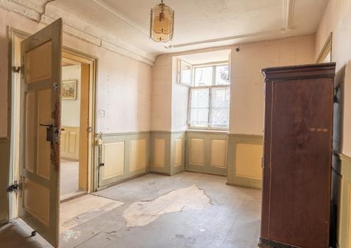 Der zur Innenstadt hingewandte Wohnbereich des Haupthauses besticht auf drei Etagen durch hohe Decken, teilweise mit Stuck, Holzsprossenfenster, Dielen- und schönen alten Fliesenböden. All diese einzigartigen Elemente werfen den Blick in eine andere Zeit und verdienen es, nach entsprechender Restaurierung wieder in neuem Glanz zu erstrahlen. Ein richtiges Schmuckstück, wo man sich sofort gerne niederlässt, ist die doppelstöckige, rundum verglaste Veranda, die im Jahr 1920 angebaut wurde.
