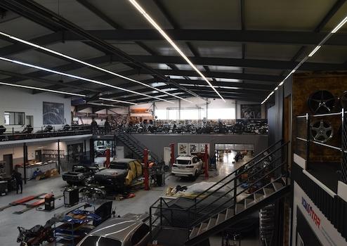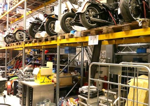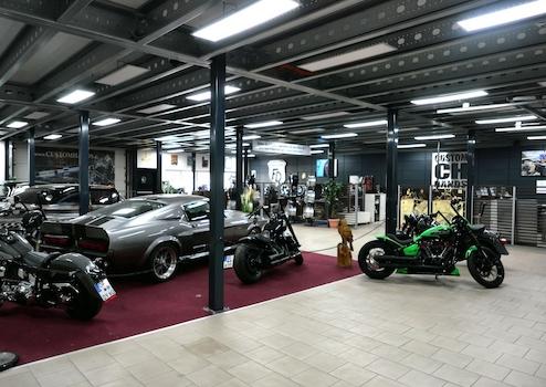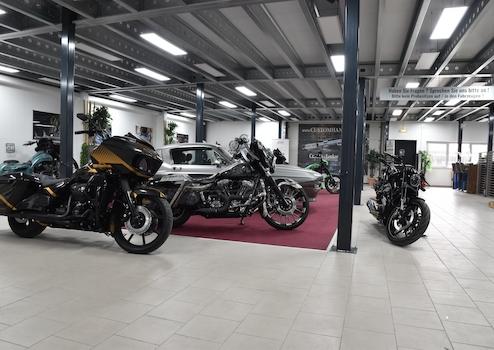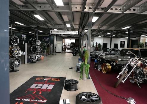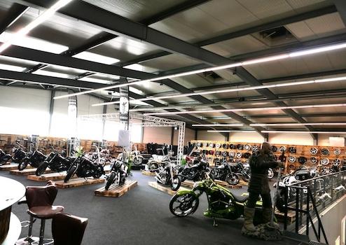 Lagerbereich mit Schwerlastregal, offene Werkstattfläche, abgeteilte Motorradwerkstatt mit Sektionstor zur Halle, Lackierkabine, Raum für Pulverbeschichtung, Schweißraum, Küche Mitarbeiter, Umkleide Mitarbeiter, Toilettenanlage Mitarbeiter, sep. WC-Raum, Zugang zum Bürobereich im Obergeschoß mit Treppenaufgang, sep. Treppenaufgang zur 2. Ebenen, sep. Treppenaufgang zur Galerie und einem Kompressor- Raum, großes Hallen-Sektionstor,