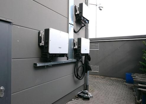Auf der Dachfläche des Gebäudes befindet sich eine moderne Photovoltaikanlage