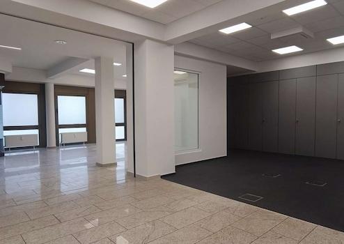Beim Betreten dieses 1958 erbauten Büros mit einer Fläche von 150m² werden Sie von einem großzügigen Eingangsbereich empfangen. Die Glasfronten sorgen für viel Tageslicht und schaffen eine einladende Atmosphäre. Vom Windfang aus gelangen Sie in die zentrale Halle, die als Empfangsbereich oder für Meetings genutzt werden kann.