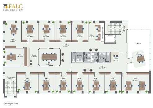 Die Etage bietet eine durchdachte Grundrissgestaltung mit variablen Raumkonzepten. Möglich sind sowohl klassische Zellenbüros, offene Großraumlösungen oder moderne Kombi-Büros. Ergänzt werden die Flächen durch Besprechungs- und Konferenzräume, Teeküchen, sanitäre Anlagen sowie Erschließungs- und Aufenthaltsbereiche. Die Grundrisse lassen eine effiziente Flächennutzung zu und schaffen gleichzeitig eine angenehme Arbeitsatmosphäre mit viel Tageslicht.