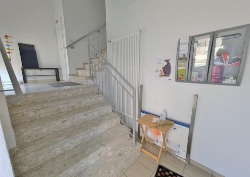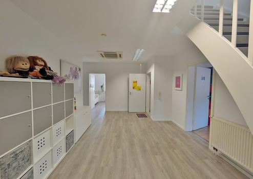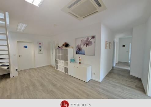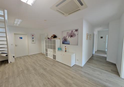 Ein separater Eingang führt Sie über eine breite Treppe direkt in das Obergeschoss, wo ein einladender, heller Empfangsbereich auf Sie wartet. Von hier aus gelangen Sie in alle weiteren Räumlichkeiten.