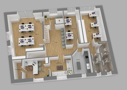 Das Highlight der Etage ist das ca. 43 m² große Großraumbüro, das mit edlem Parkettboden ausgestattet ist und Platz für drei bis vier großzügige Schreibtische bietet. Ein großer Tresor sorgt hier für zusätzliche Sicherheit. Vier weitere Büroräume, zwischen ca. 9 m² und 26 m² groß, sind mit einem stilvollen Vinylboden in Holzoptik versehen und bieten eine angenehme Arbeitsatmosphäre. Große Fensterfronten durchfluten die gesamte Etage mit natürlichem Licht.