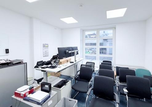 Die technische Infrastruktur lässt keine Wünsche offen: LED-Beleuchtung, Fußbodenheizung, Cat7-Datenverkabelung und die Möglichkeit eines Glasfaseranschlusses sorgen für modernste Arbeitsbedingungen. Ein klimatisierter Serverraum rundet das funktionale Konzept ab.