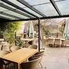Der Außenbereich bietet eine Terrasse mit Glasdach und Markise im hinteren Bereich sowie eine zusätzliche Markise im Eingangsbereich. Eine Outdoorküche steht für private Nutzung und Weiterentwicklung bereit.