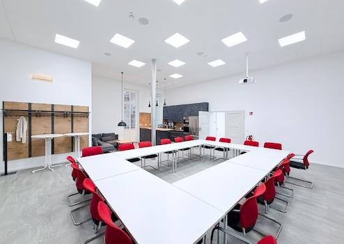 Die technische Infrastruktur lässt keine Wünsche offen: LED-Beleuchtung, Fußbodenheizung, Cat7-Datenverkabelung und die Möglichkeit eines Glasfaseranschlusses sorgen für modernste Arbeitsbedingungen. Ein klimatisierter Serverraum rundet das funktionale Konzept ab.