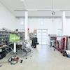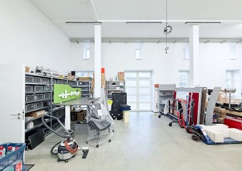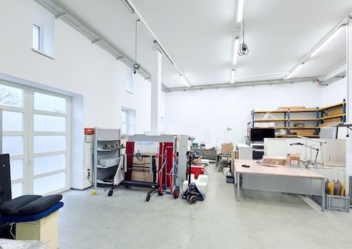 Im Erdgeschoss befindet sich ein Lagerbereich mit praktischem Regalsystem sowie eine ebenerdige Anlieferung über eine Doppeltür, die effiziente logistische Abläufe ermöglicht.