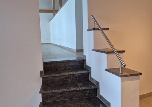 Dieses repräsentative Objekt besticht durch die hochwertigen Materialien und den besonderen Schnitt mit vier versetzten Ebenen. Ein heller Eingangsbereich bietet Platz für den Empfang Ihrer Kunden und deren Garderobe. Links führt eine Granittreppe direkt in den lichtdurchfluteten Arbeitsbereich mit zwei Ebenen. Nach dem Eingang befinden sich auf der rechten Seite das WC und die Teeküche (mit Einbauküche). Im Anschluss daran gibt es ausreichend Platz für einen Wartebereich und eine Aufenthaltsecke. Von dort aus führt noch eine Treppe in die untere Ebene des Bürogebäudes, die wunderbar als Nebenraum genutzt werden kann.