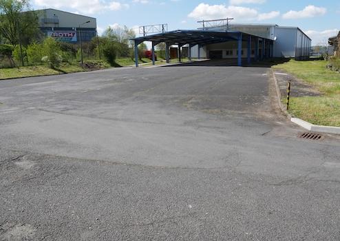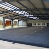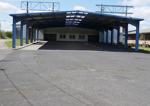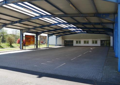 Parkplätze in Front der Halle sind überdacht (ca. 600qm) hier gibt es jeweils einen Ein- und Ausgang über eine Doppelte Schiebetür.