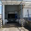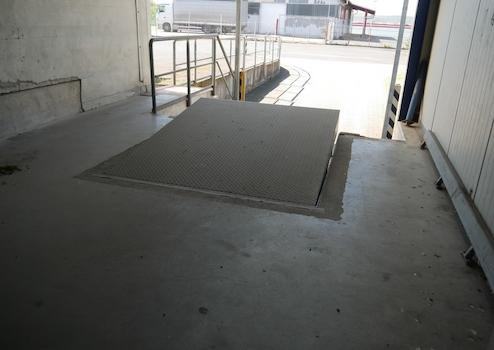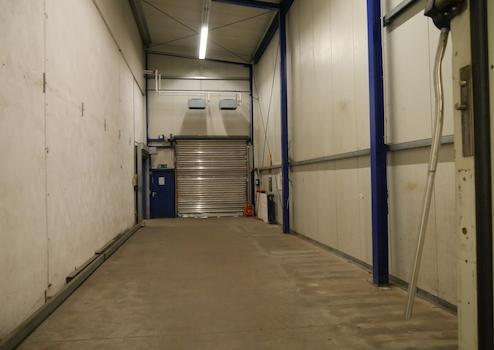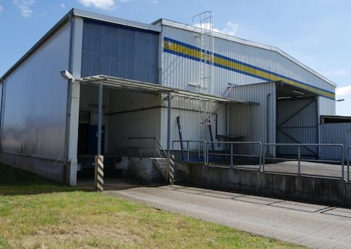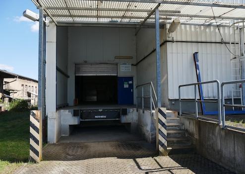 Auf der Rückseite befindet sich eine LKW Laderampe mit separaten Raum zum abstellen der Ware. Ebenfalls auf der Rückseite ist ein großes Rolltor zum befahren der Halle.