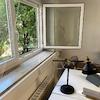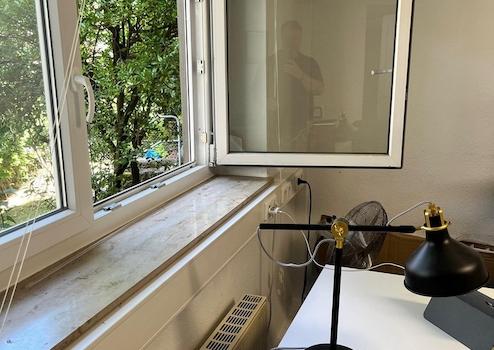 Das Büro befindet sich im UG/Gartengeschoss eines Mehrfamilienhauses mit ruhigem Blick nach draußen.