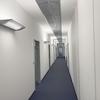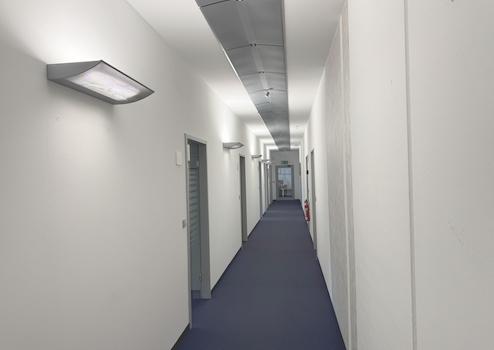 Die Büros werden über Neonröhren beleuchtet, der Gang hat eine moderne Beleuchtung mit Deckenfluter an den Wänden und zusätzlichen LED-Spots an der Decke.