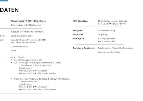 Das Mietobjekt zeichnet sich durch eine attraktive zentrale Lage, die exklusive Alleinnutzung sowie durch die unmittelbar am Gebäude verfügbaren Parkmöglichkeiten aus. Über ein großzügiges Treppenhaus mit breiter Treppe gelangen Sie in das 2-geschossige Gebäude. Sowohl im EG wie auch im 1. OG erreichen Sie alle Räume über einen langen gut beleuchteten Flur. Die derzeitige Aufteilung der beiden Geschosse sind 10-11 Büros/Besprechungsräume, jeweils eine Küche, eine Abstellkammer, einem Technikraum und Sanitärräumen.