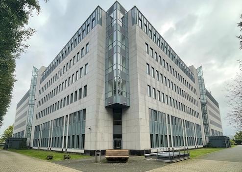 Das Objekt präsentiert sich mit seiner hochwertigen Fassade aus hellgrauem Granit, Aluminium und Glas werbewirksam an Ratigens Kaiserswerther Straße.