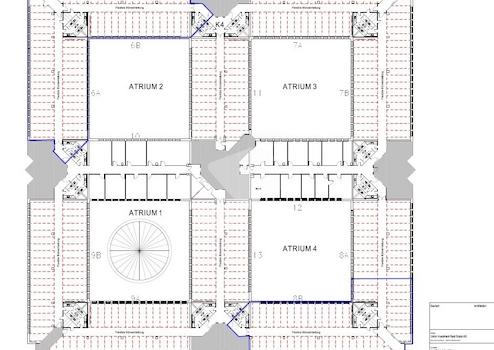 Um die vier groß dimensionierten Atriumhöfe, die dem Objekt seinen namen gaben, gruppieren sich Büroeinheiten von jeweils ca. 350 und ca. 405 m², die dem Mieter zusammengeschaltet bis zu rund 4676 m² Raum auf einer Etage bieten können. Ein umbaufähiges Trennwandsystem ermöglicht unterschiedlichste Raumzuschnitte, was die Immobilie für kleine Firmen wie auch Unternehmen mit großem Personalstamm interessant macht. Das zweigeschossige, lichtdurchflutete Foyer des Gebäudes (mit serviceorientiertem Casino inkl. Catering-Angeboten für z.B. Konferenzen im Haus) ist nicht nur Treffpunkt für Mieter und Besucher, sondern kann auch als exklusives Ambiente für Events und Präsentationsraum sowie für Ausstellungen genutzt werden.