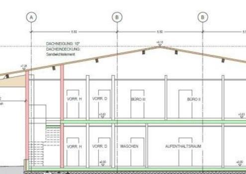 Die Neubauhalle mit Vordach ist in Betonbauweise errichtet und es sind sieben elektrisch betriebene Sektionaltore mit ca. 4,75 x 4,50 m vorhanden. Die ca. 6 m hohe Halle ist in KfW 40-Bauweise erstellt und mit einer Fußbodenheizung mit Betonkernaktivierung ausgestattet. Eine Hallenkran-Vorrichtung für einen 5 t Hallenkran ist installiert. Es kann ein Bürotrakt über eine oder zwei Etagen abgetrennt werden. In jedem Hallenabschnitt sind Wasser- und Abwasseranschlüsse vorhanden, sodass WCs, Umkleiden, Aufenthaltsräume und Waschräume eingebaut werden können. Aufgrund der vielen Fenster ist die Fläche sehr hell. Zusätzlich ist eine Hallengrundbeleuchtung mit LED-Leuchten vorhanden.
