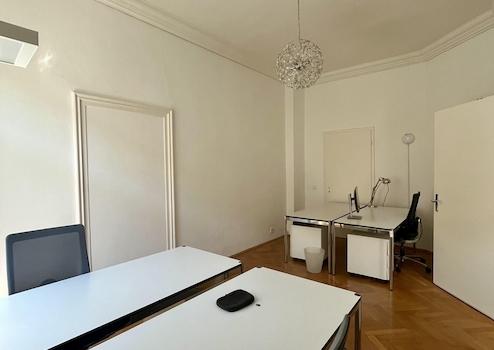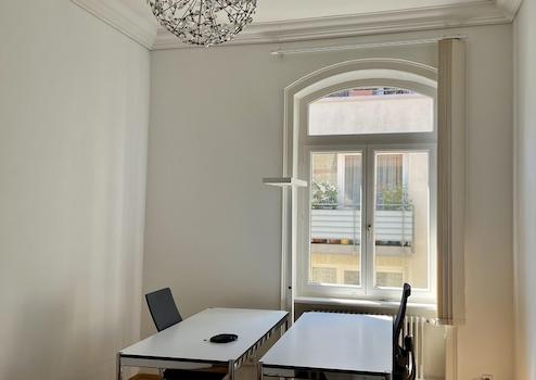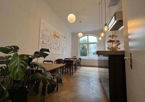 Neben den hohen Decken, lichtdurchflutet Räumen, Stuck, und tollen Parkettböden darfst Du Dich an dem gelungenen Mix aus alt und neu erfreuen, der sich in allen Besprechungsräumen, dem Konferenzraum im Wintergarten, aber auch der Küche spiegelt.