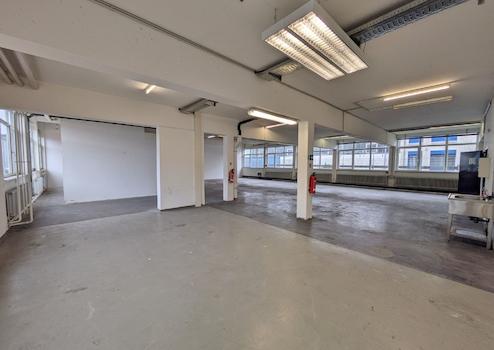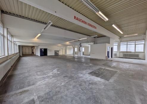 Diese Fläche ist mit einem Schwerlast geeigneten Betonboden, einem Wasseranschluss und diversen Starkstromanschlüssen ausgestattet. Durch die zahlreichen Fensterflächen an den beiden Längsseiten der Immobilie ist eine optimale Versorgung mit natürlichem Tageslicht garantiert. Zusätzlich sind integrierte Deckenleuchten vorhanden. Die Deckenhöhe beträgt ca. 3,40 m und zur Straßenseite ist die Halle über ein elektrisches, ca. 2,40m (h) x 2,60m (b) Sektionaltor zu erreichen.