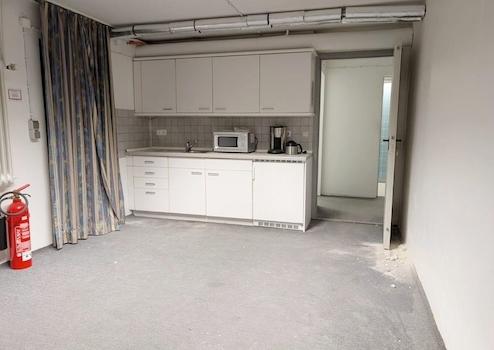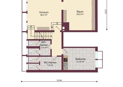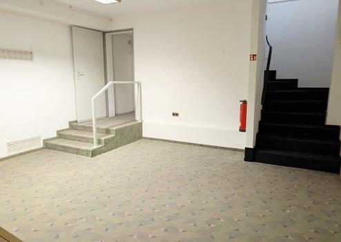 Über eine offene Treppe gelangen Sie in den funktionalen Kellerbereich, der zusätzliche Nutzfläche bietet. Hier finden Sie einen geräumigen Vorraum, einen separaten Lagerraum, eine Teeküche, sowie getrennte WC-Anlagen für Damen und Herren.