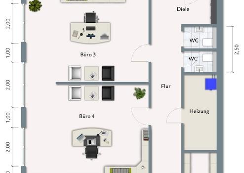 Das Büro ist bereits vollständig renoviert und könnte demzufolge umgehend bezogen werden. Die Kaltmiete beträgt EUR 1.155,-, auf Wunsch können bis zu 3 PKW-Stellplätze vor dem Gebäude für jeweils EUR 30,- im Monat angemietet werden. Die Heiz- und Nebenkosten liegen bei EUR 250,- monatlich, es kommt noch die MWSt hinzu.