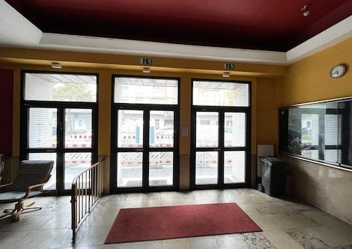 Die Gewerbefläche verfügt über einen geräumigen Eingangsbereich mit einigen Sitzmöglichkeiten, einer Theke und einem Kassenbereich.