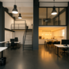 Die komplette Einheit präsentiert sich im industriellen Loftstil. An den Decken hängen große Stahllampen dem Style entsprechend.