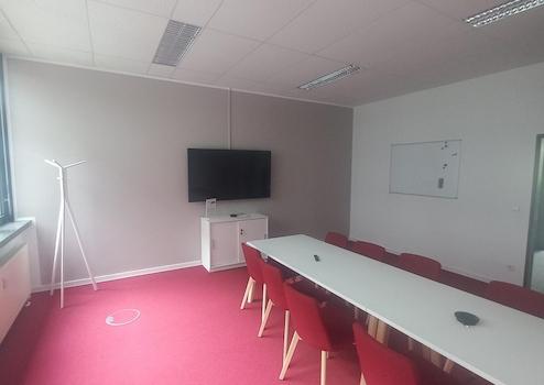 Raumstruktur: Zwei helle, moderne Besprechungsräume mit eleganten Glastüren sowie ein separater Lagerbereich.