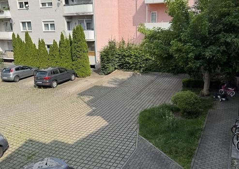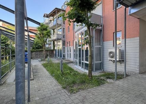 Im Westen sorgt eine große Verglasung für Sicht-, Lichtverbindung und Zugang zu den Terrassen sowie den Grünflächen im Innenhof. Zudem werden drei Außenstellplätze auf dem Nachbargrundstück geduldet und stehen der Einheit zur Verfügung.