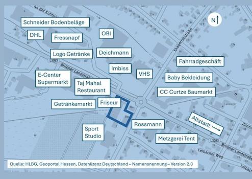 Die Gewerbeimmobilie liegt in der nordhessischen Kreisstadt Korbach an einer stark frequentierten innerstädtischen Kreuzung. Die Lage ist infrastrukturell hervorragend angebunden: In unmittelbarer Nähe befinden sich zahlreiche Einzelhandelsunternehmen, ein Fitnessstudio und Nahversorger. Die Zufahrt erfolgt direkt über die Einfahrtsstraße aus Richtung Willingen/Brilon und sorgt für optimale Erreichbarkeit und Sichtbarkeit. Die Lage, kombiniert mit den Parkmöglichkeiten und der gewerblichen Prägung des Umfelds, macht das Objekt besonders attraktiv für verschiedenste Nutzungen.