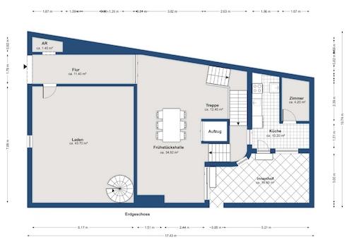 Beim Betreten dieses charmanten, kleinen Hotel´s am Rande der Hof`er Altstadt werden Sie von einem einladenden Eingangsbereich empfangen, der sowohl Gästen als auch Betreibern eine angenehme Atmosphäre vermittelt. Das Erdgeschoss beherbergt den Empfang, das Frühstücksrestaurant , die Küche und nach vorn zur Straße noch eine ca. 45 m² große Gewerbeeinheit (ehemals Spielothek), die man vielfältig umgestalten und für das Hotel nutzen oder ggf. auch als Laden vermieten kann.